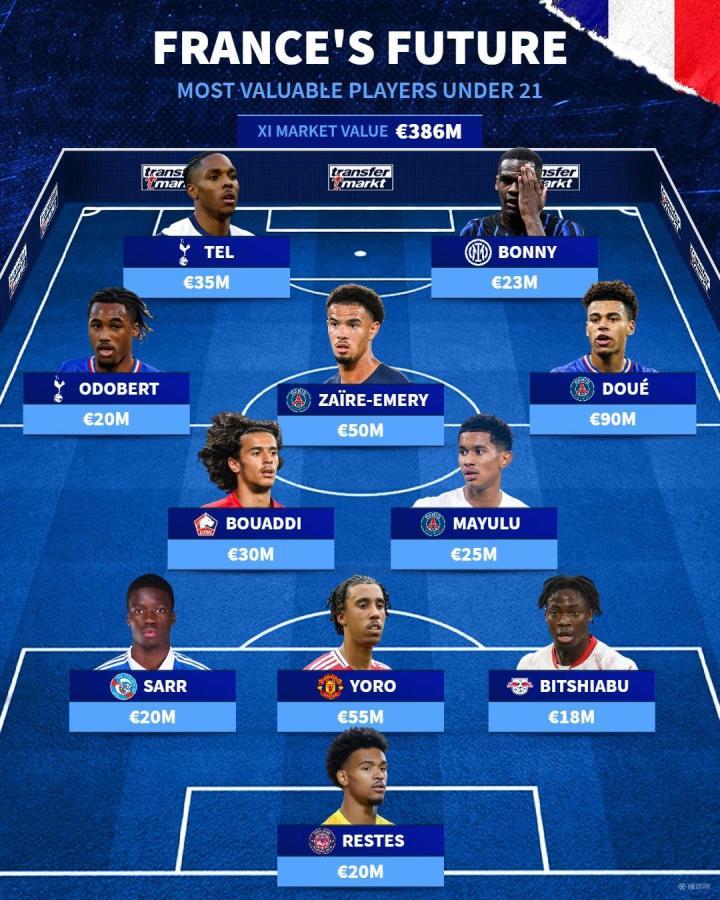 德转列法国U21最贵阵容:杜埃领衔,约罗、埃梅里等人在列